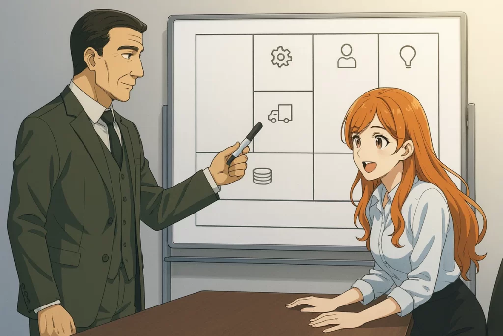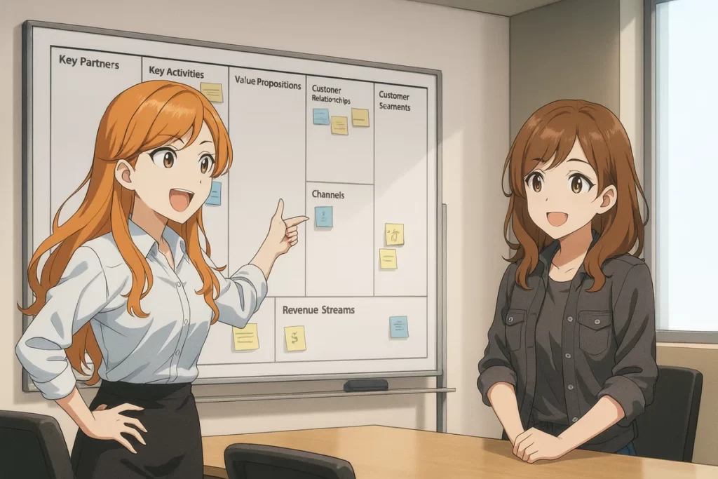 鈴木「では、今日はビジネスモデルキャンバス(BMC)で全体を設計します。理念を”事業の地図”に落とす仕上げですね。」