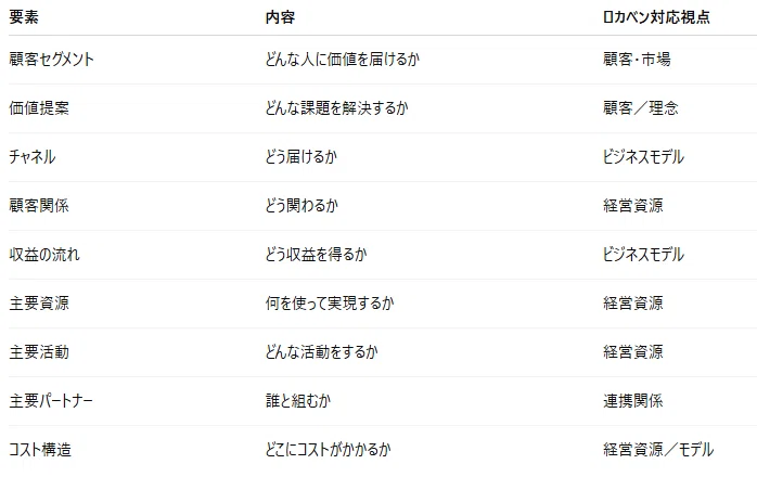 - 顧客セグメント・価値提案・チャネル・顧客関係・収益の流れ