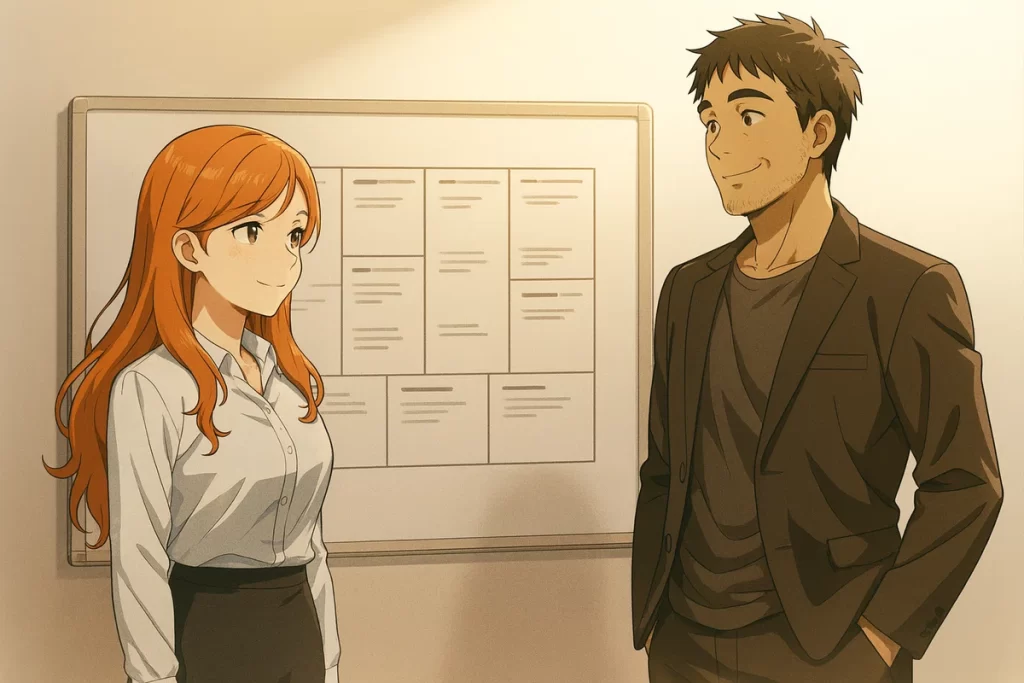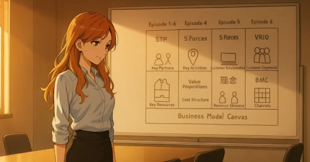会議が終わった後、凛子は一人会議室に残った。ホワイトボードに描かれたBMCを見つめながら、これまでの道のりを振り返っていた。